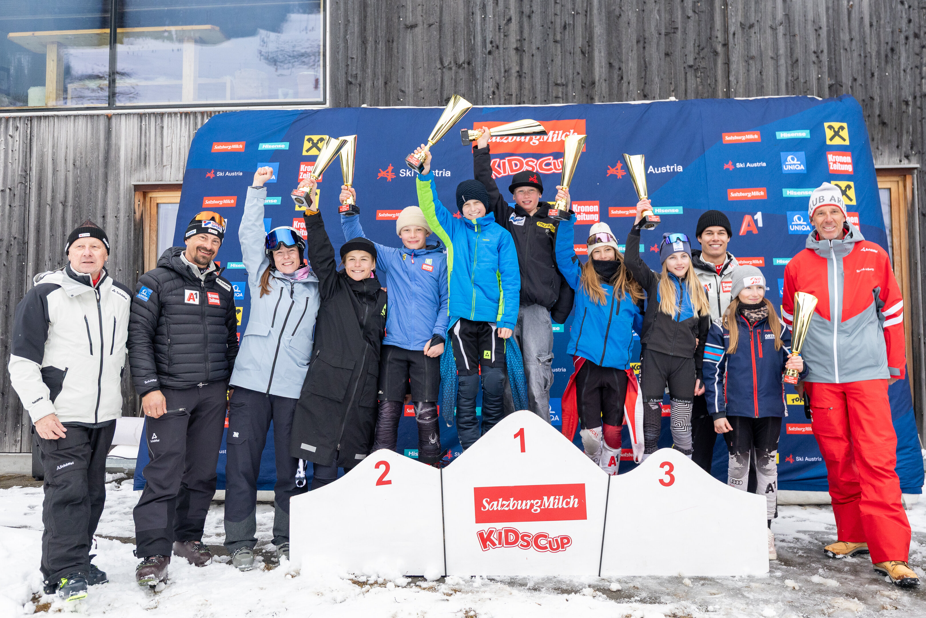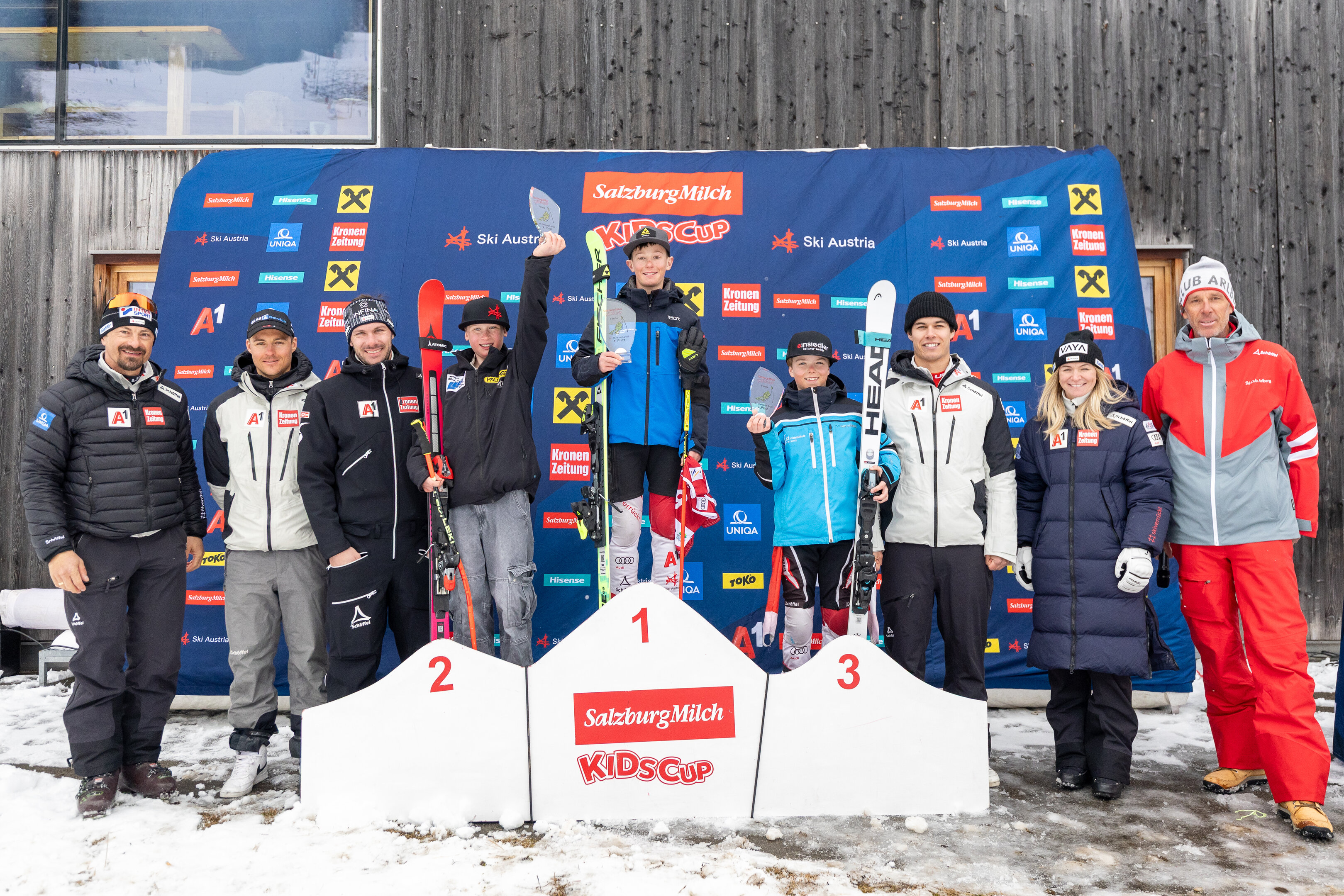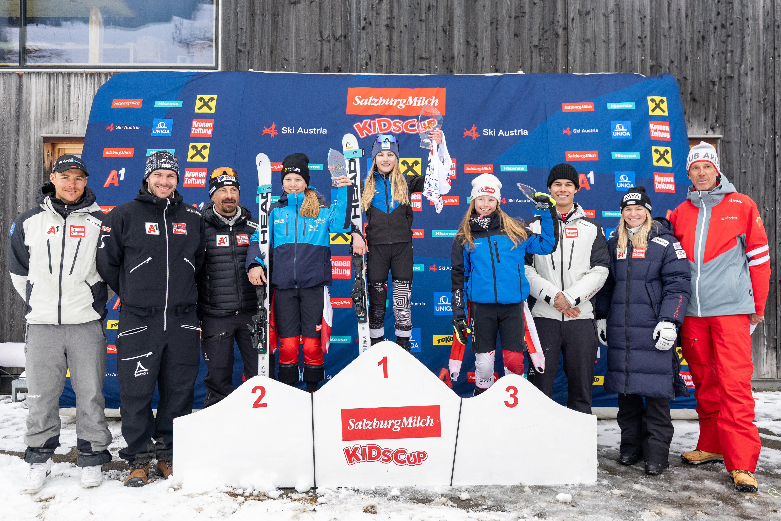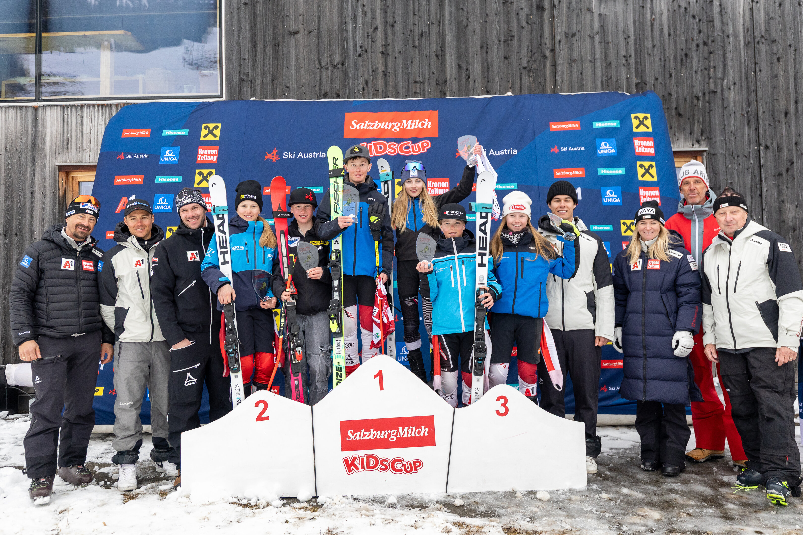 Am Sonntag fand die bereits mit Spannung erwartete Finalveranstaltung der SalzburgMilch Kids Cup Serie statt. Auf dem sehr anspruchsvollen Zielhang der Damenabfahrtsweltcupstrecke standen acht Teams am Start. Diese wurden neben Trainer:innen der Landesskiverbände von den ÖSV-Stars Ariane Rädler, Lukas Feurstein, Michael Matt und Simon Ruland betreut, ein herzliches Danke dafür. Gefahren wurden zwei Durchgänge, wobei die bessere Zeit in die Wertung kam.