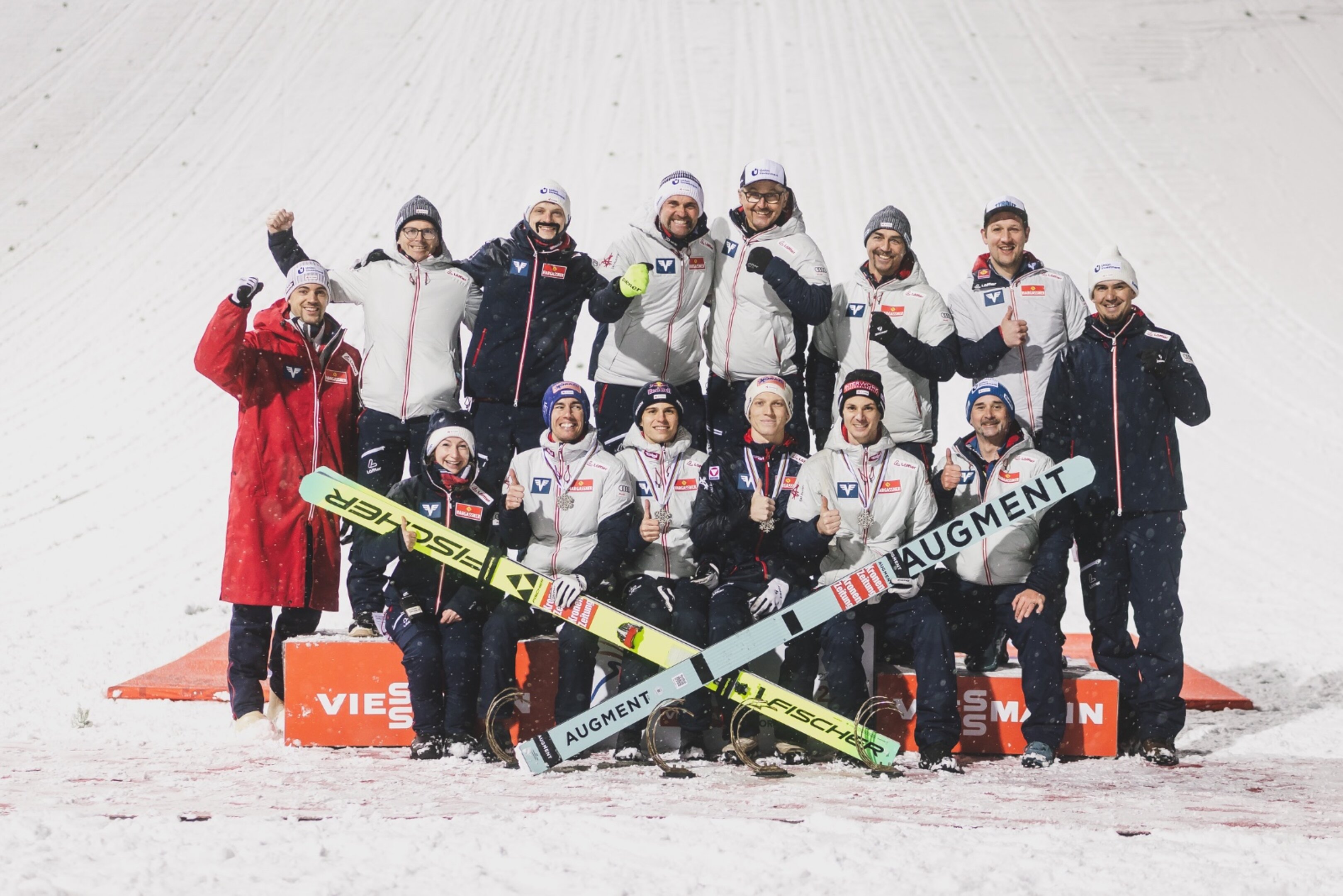 Jan Hörl, Stefan Kraft, Stephan Embacher und Manuel Fettner mussten sich nur Japan um 9,6 Punkte geschlagen geben. Auf dem dritten Platz landete Norwegen. Titelverteidiger Slowenien fiel nach einem kuriosen Zwischenfall um Domen Prevc im ersten Durchgang chancenlos zurück.