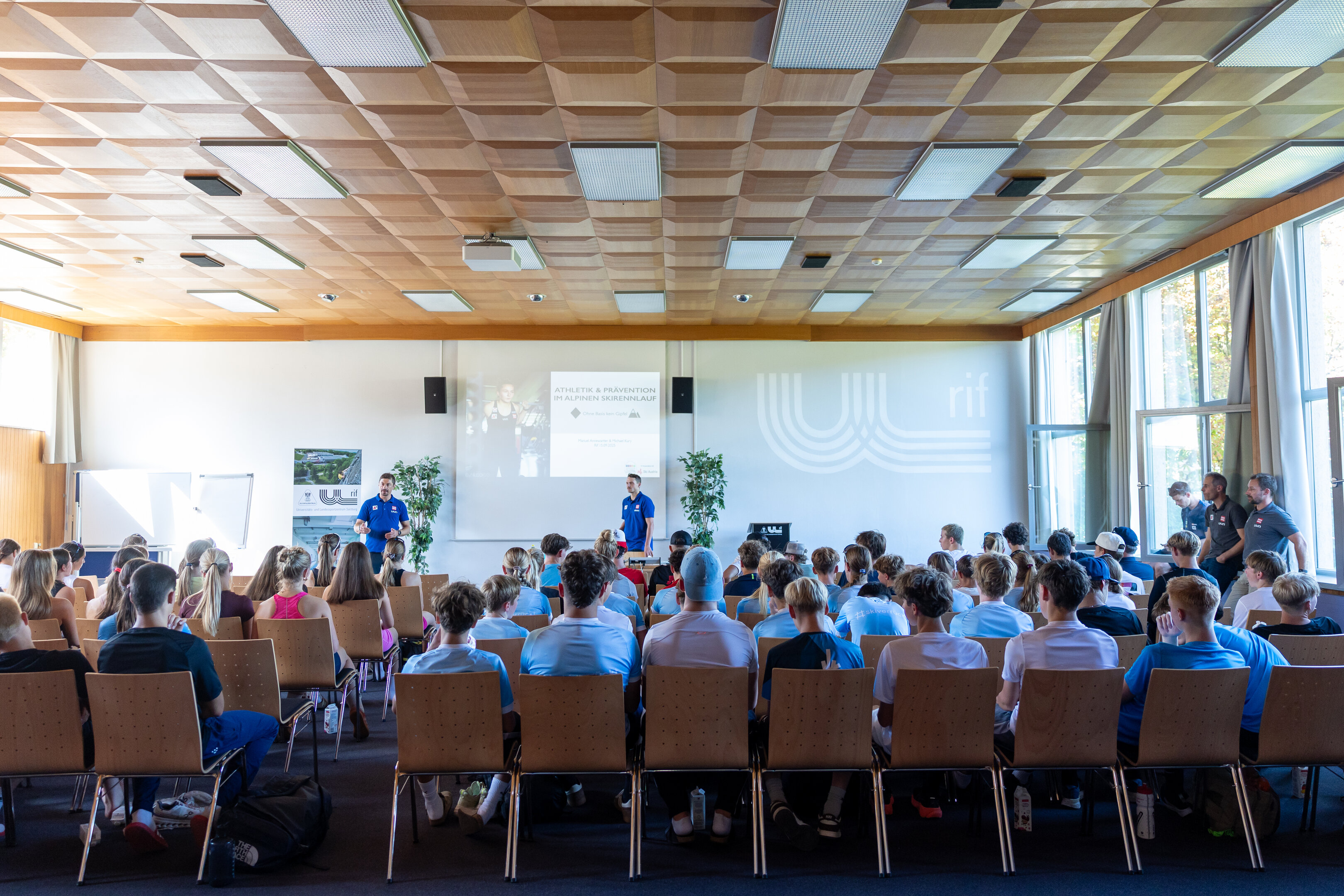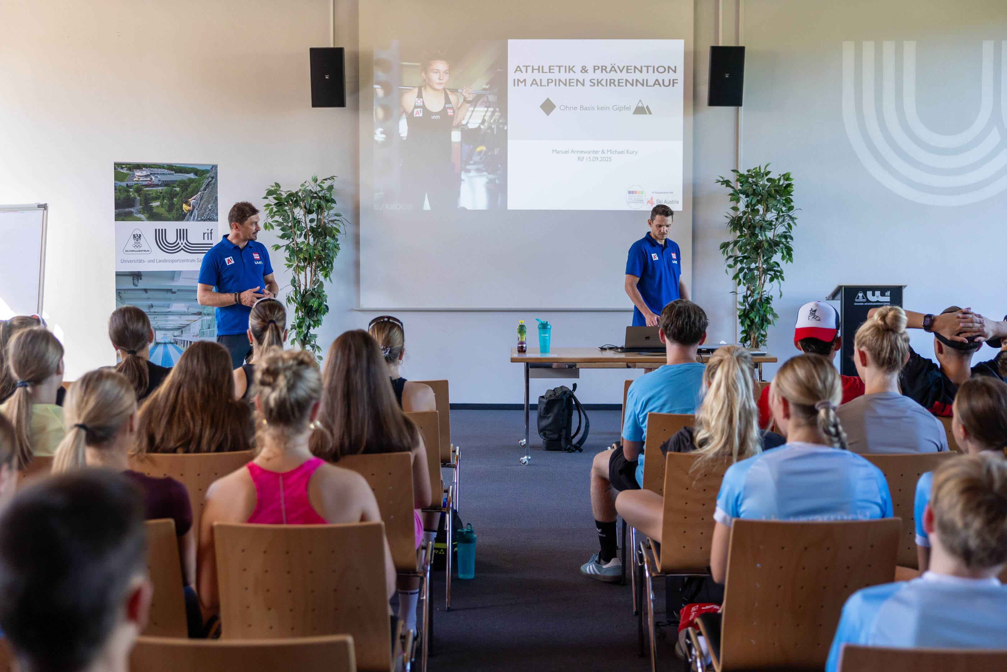 Nach Abschluss des 3000 Meter Laufs versammelten sich die Athlet:innen, Trainer:innen und Eltern im Hörsaal, wo ein informativer Vortrag zum Thema "Athletik und Prävention im Alpinen Skirennsport" vom Athletikoordinator des Ski Alpin Nachwuchs, Manuel Annewanter, und vom Präventions- und Rehamanager, Michael Kury, gehalten wurde. Dabei erhielten die Athlet:innen wertvolle Einblicke in die wichtige Rolle der Athletik und Prävention.